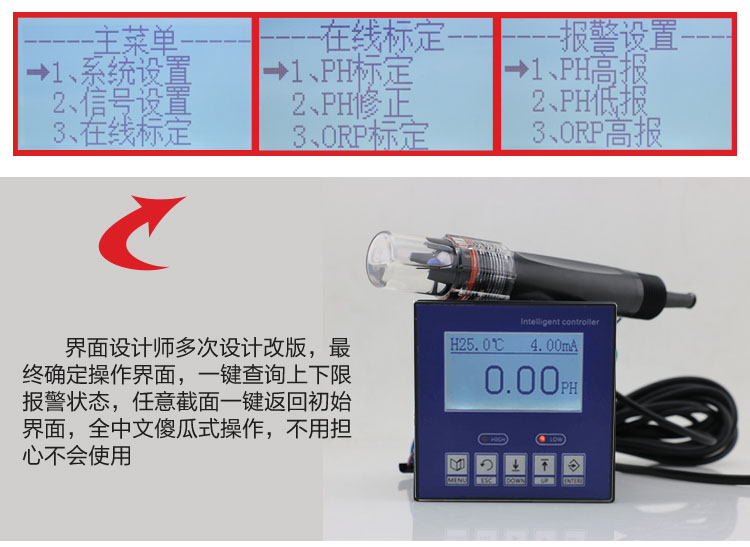 1、主要特點 ? 板卡模塊化設(shè)計,組裝配置更加方便。 ? 采用2.4寸12864 點陣屏 ? 采用隔離變送輸出,干擾度更小 ? 采用隔離RS485通訊 ? 可進行PH/ORP的測量、溫度測量、上下限控制、變送輸出、RS485通訊 ? 可組態(tài)溫度手動、自動補償功能 ? 可設(shè)置高、低報警功能,及遲滯量 ? 可設(shè)置蜂鳴器、燈光報警開關(guān)功能 ? 增加萬能密碼功能 ? 工業(yè)控制式看門狗,確保儀表不會死機